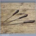 This is one of our recently sold items: Three needle files with rosewood and brass handles in untested condition although these do seem reasonable condition, these are bonus really as the handles are well worth the asking price.